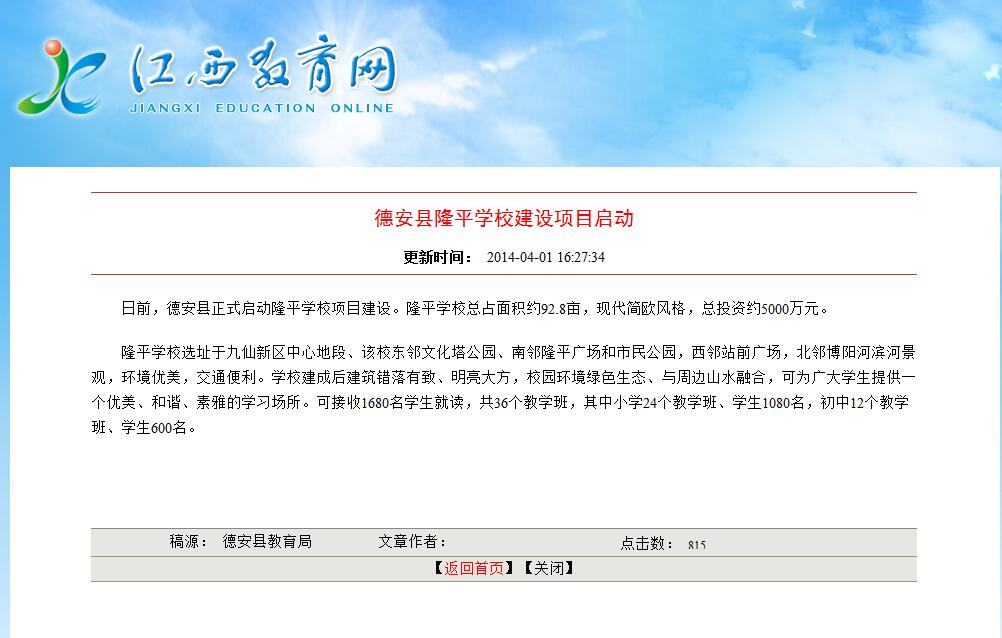 隆平中學是以袁隆平院士命名的一所高級中學,德安縣正式啟動隆平學校項目建設。隆平學校總占面積約92.8畝,現代簡歐風格,總投資約5000萬元。