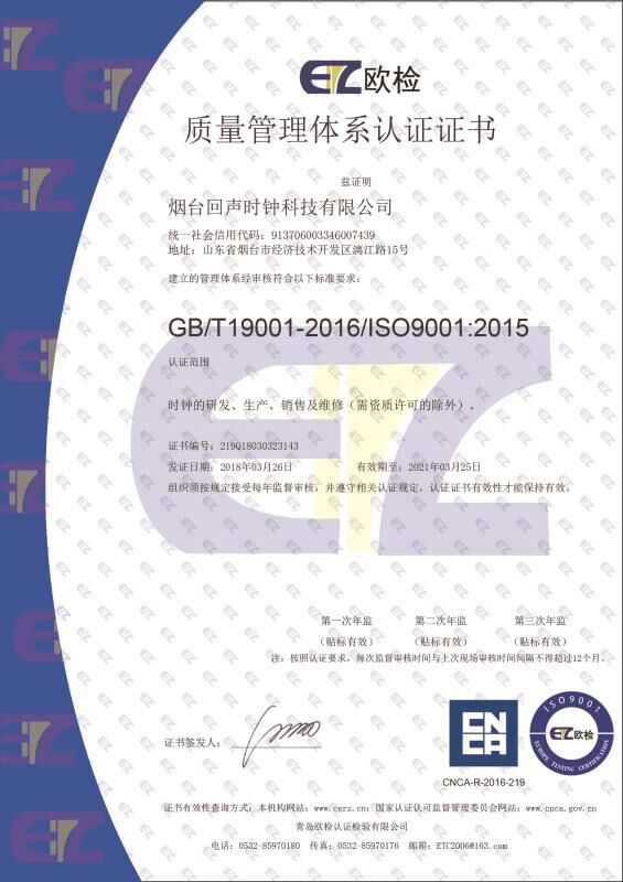 熱烈祝賀我公司順利通過ISO9000質量管理體系認證,通過一年的緊張努力的整理、整頓、改進各項生產工序、生產工藝,今日順利通過9000質量認證專家組的評審,這是我們公司在產品質量方面更上一個臺階,我們嚴把產品質量關,把這個作為企業的生命線,認真做好每一道工序,每一個產品零件,這樣才能保證產品整體質量過過硬,讓客戶更放心,使用更安心,這也是回聲時鐘科技每一位員工共同目標,創造更好的產品服務于社會。